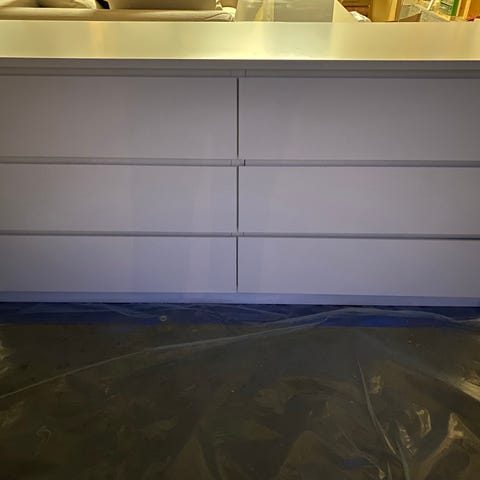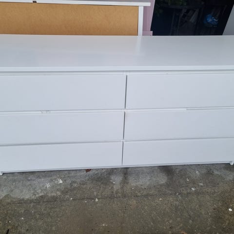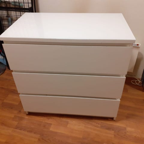 IKEA malm kommode med seks skuffer og glassplate selges. En av «listene» mellom to skuffer er knekt, men dette har ingen påvirkning på bruken.