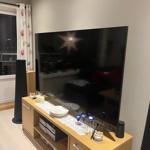 Samsung TV. Flat skjerm-TV egnet for stue eller soverom. Vises her plassert på TV-benk. Passer til tilkobling av eksterne enheter som dekoder, spillkonsoll eller mediespiller via tilgjengelige innganger på baksiden eller siden av TV-en, avhengig av modell. TV-en kan brukes både til TV-sendinger og strømming ved bruk av tilkoblet utstyr eller innebygde funksjoner, avhengig av modell og årgang.