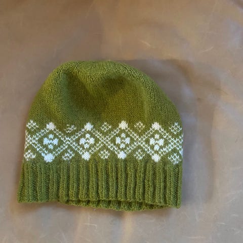 Fin og varm, grønn mønstret lue i ull. Lua er veldig fleksibel og passer derfor mange størrelser.