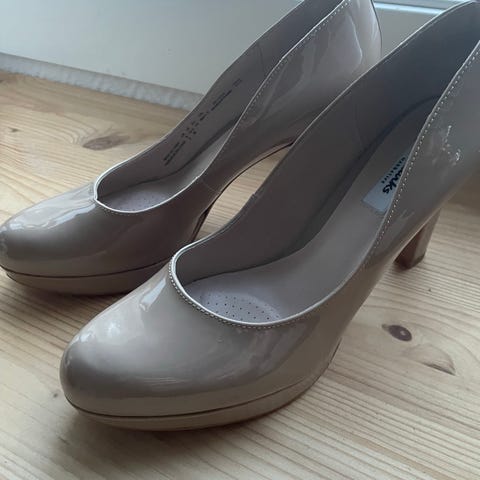 Clarks pumps med hæler, størrelse 41,5. (7,5) Søte, svarte med hvit søm. Mellomhøy hæl på 7 cm og avrundet tupp med sløyfedetalj foran.