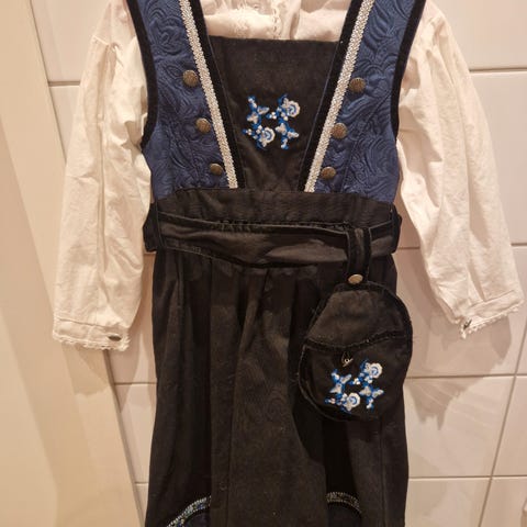 Name it bunadkjole for jente i størrelse 110. Kjolen er flerfarget med mørk skjørtedel og broderte blomsterdetaljer nederst. Overdelen har mønster og brukes sammen med hvit skjorte med lange ermer. Det følger med en liten veske i matchende stil. Passer til bruk ved høytider, feiringer og andre anledninger der man ønsker et tradisjonsinspirert antrekk for barn.