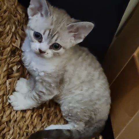 Gråhvit cornish rex-hunn, 4,5 måneder gammel, søker familie