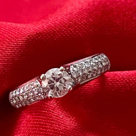 Stein er ca. 1,5 cm. 7 rader med små stener på hver side av ringen. Den lille esken den ligger i er kun for bilde og følger ikke med. Pent brukt en gang og fremstår som ny #ring #blingbling