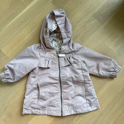 Newbie jakke for barn, størrelse 86. Jakken er rosa med fin fasong. Modellen har hette med mønstret fôr og glidelåslukking foran. Passer til jente og egner seg som ytterjakke i overgangssesonger avhengig av vær og temperatur.