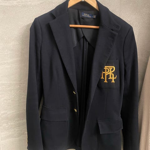 Polo Ralph Lauren klassisk blazer for dame i amerikansk størrelse 14, norsk 44/46. Blazeren er fiskebensmønstret, den er brun med svarte "fiskeben". Fargen er varmere og mørkere sjokoladebrun enn hva bildene viser. Fargen på blazeren ligger tettest på bildet av splitten i midtsømmen bak. Blazeren passer både til hverdags og mer formelle anledninger.