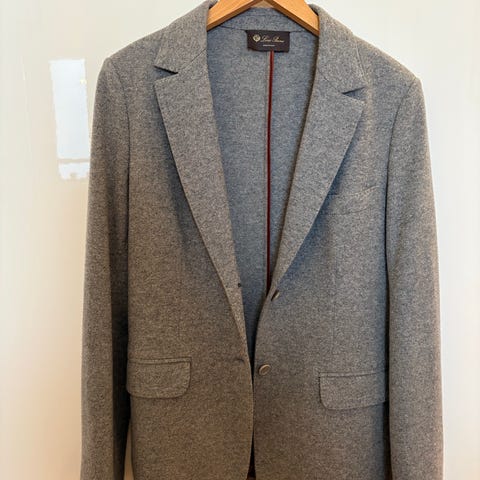 Blazeren har klassiske jakkeslag, to knapper i front og fire knapper nederst på ermene. Modellen har to store lommer med klaffelommer foran. Over den ene er det en liten lomme med klaff. Blazeren har en god passform. Den er er innsvinget ved hjelp av langsgående innsnitt i midjen, innsnitt fra under ermene til kanten nede foran og bak og midtsøm bak som ender i en splitt. Forstykkene er avrundet nederst.