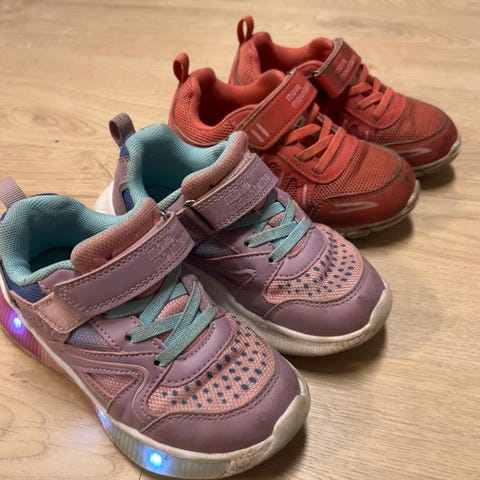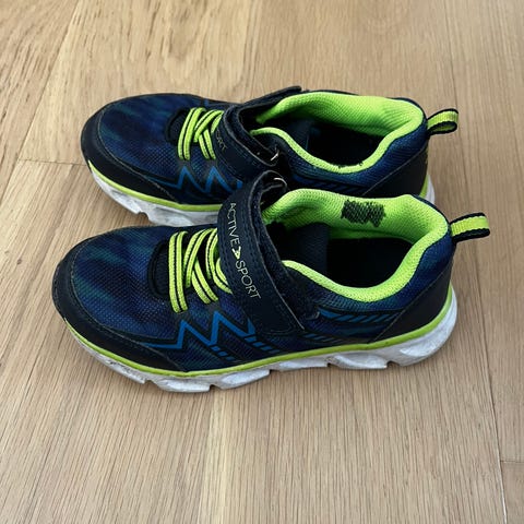 unisex joggesko i størrelse 28. Skoene er blå med mørke lisser og borrelåslukking over vristen for enkel av- og påkledning. Overdelen er i tekstil med syntetiske detaljer, og sålen er kraftig mønstret gummi for godt grep. Passer til hverdagsbruk og aktivitet for barn.