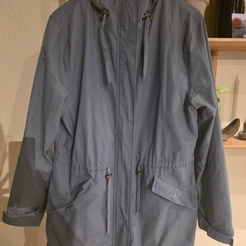 Blå ytterjakke i merket Åshild for dame i størrelse 46. Jakken har løs hette med snorjustering, glidelåslukking med knappestolpe og to frontlommer med glidelås. Oppbrettbare ermer viser en lysere blå innside. Passer som ytterjakke vår/sommer/høst. Brukt kun 2 ganger.