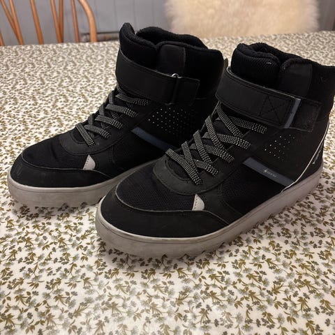 Viking vinterstøvler i størrelse 40. Modellen er en høy ankelstøvel med snøring og borrelås øverst. Skoene er svarte med lys såle og har Gore-Tex-membran.