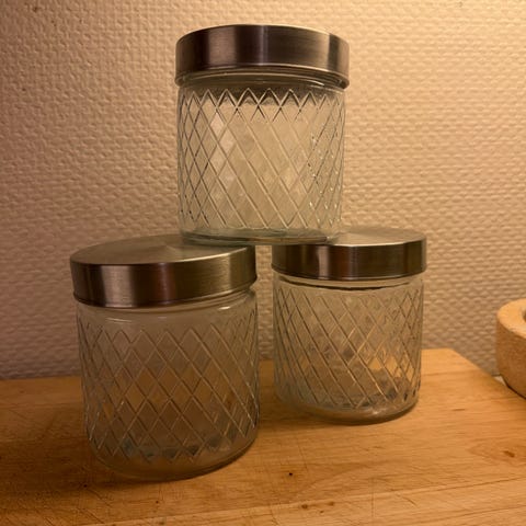 Den andre er fra IKEA. 15cm bred, 18cm høy (rommer 1,9l)