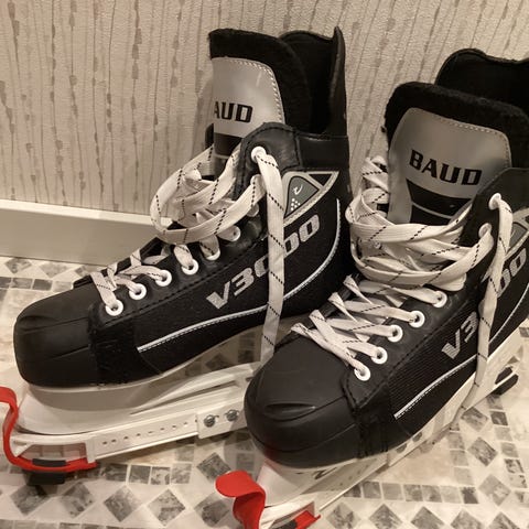 Torspo ishockeyskøyter i størrelse 43. Modellen er laget for ishockeybruk, med sort yttermateriale og hvite lisser. Skøytene har polstret ankelparti for støtte og komfort, samt stålklinger tilpasset ishockey. Passer til bruk på isbaner og ishaller for trening og fritidsspill.
