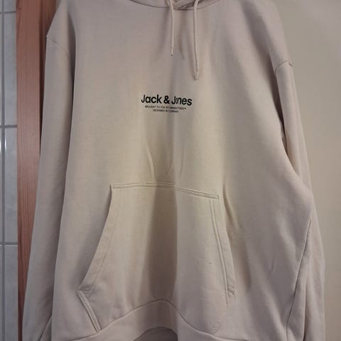 Jack & Jones hettegenser for herre i størrelse M. Genseren er grå og laget i bomull. Modellen har hette med snøring og ribbekanter nederst og på ermene. Fronten har trykk/broderi med motiv og Jack & Jones-logo. Passer til hverdagsbruk og fritid.