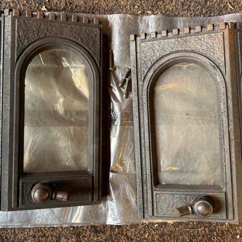 Delene tilhører en eldre Jøtul 80 Maxi peisinnsats. 2stk doble dører, frontleppe og hengsler/splinter/fester. Dørene er 39cm høye og trenger nye pakninger.
