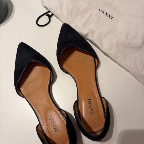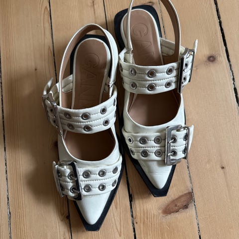 Eyelets Bow Ballerina Glitter fra GANNI er supersøte ballerinasko i sølvfarget glitterutførelse med sort, lakkert kant og blanke nagledetaljer. Liten sløyfe over den butte tåen og liten, rund hæl