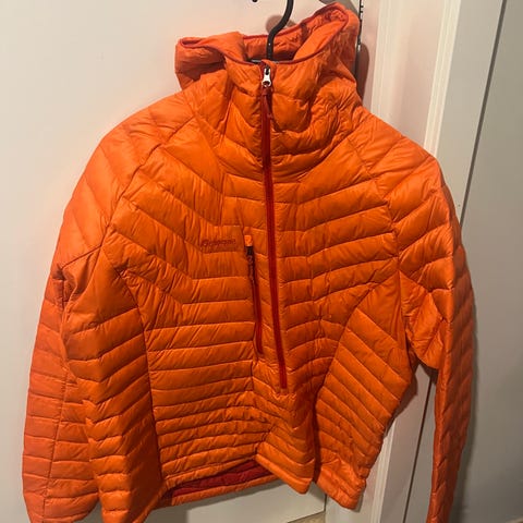 Skogstad dunjakke for dame i størrelse 38. Jakken er oransje og har lett vattert dunfyll med horisontale og skråstilte sømmer som gir en jevn fordeling av fyllet. Modellen har glidelås i front, høy krage og elastiske avslutninger ved ermer og nederkant for bedre passform. Egnet som ytterjakke i kjøligere vær eller som et isolerende mellomlag under skalljakke.