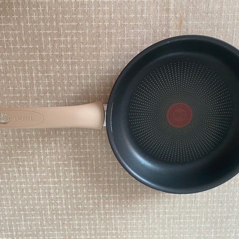 Tefal stekepanne med non-stick belegg. Pannen har mørk innside med Tefals karakteristiske røde varmeindikator i midten. Utsiden har en bunn med mønster som er tilpasset jevn varmefordeling. Håndtaket er langt og ergonomisk utformet i mørk plast. Egner seg til daglig matlaging av for eksempel kjøtt, fisk, egg og grønnsaker. Kan brukes på ulike typer kokeplater, avhengig av modellens spesifikasjoner.