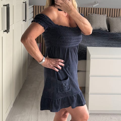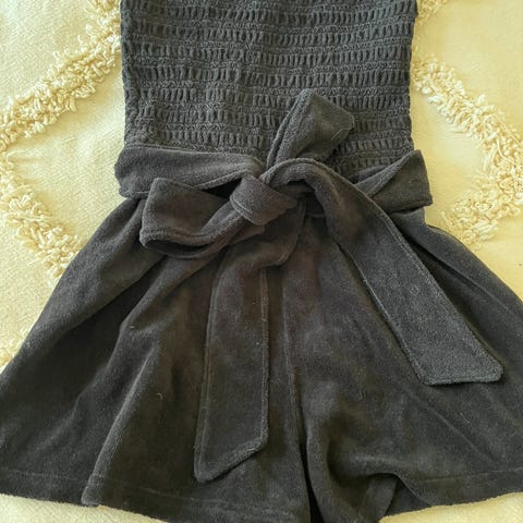 Juicy Couture playsuit i størrelse S. Stroppeløs modell med smocket overdel og korte ben. Plagget er rødt og laget hovedsakelig av bomull (med noe polyester i stoffblandingen). Leveres med knytebelte i livet.