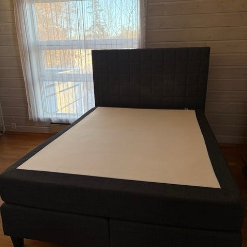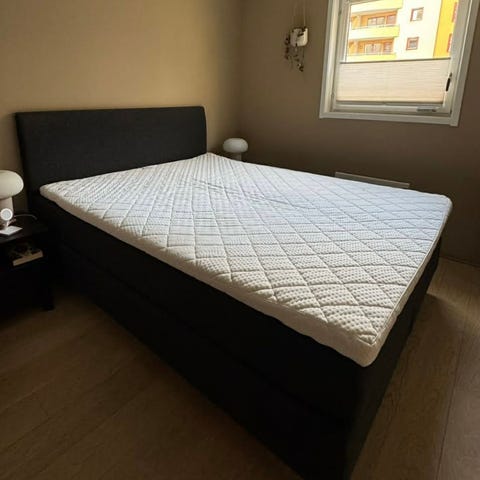 Kontinental seng med gavl trukket i mørkt tekstil. Sengen står på runde ben i metall og har en rett, polstret hodegavl med enkel mønstersøm. Overmadrass er plassert oppå sengebunnen. Passer som dobbeltseng i soverom. Nøytral, mørk farge gjør at sengen kan kombineres med ulike interiørstiler.