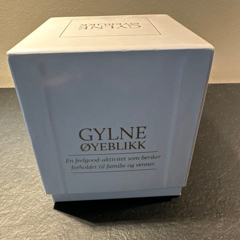 Gylne Øyeblikk samtalespill er et kortspill med 222 spørsmål og oppspill til samtaler. Spillet består av kvadratiske kort med spørsmål trykket på hver side, laget for å brukes i samtaler mellom familie, venner eller andre grupper. Esken inneholder kort og en enkel oversikt over spilleregler og ulike måter å bruke kortene på. Produktet egner seg til sosiale sammenkomster, familiesituasjoner eller andre anledninger der man ønsker temaer og spørsmål som kan brukes som utgangspunkt for samtale.