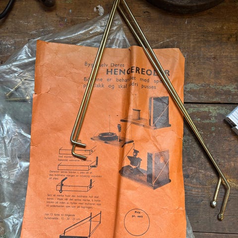 Selger eldre hylleknekter i rundstål – samme type som ble brukt på vegghengte teak-reoler fra 60–70-tallet.
