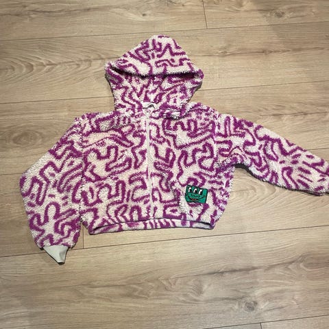 H&M hettejakke for barn i størrelse 146. Jakken er hvit og laget i polyester med myk, fluffy overflate. Den har hette og glidelås foran. På brystet og ryggen er det påsydd smiley-motiv, med større motiv og «SmileyWorld»-tekst på baksiden. Passer som hverdagsjakke eller som ekstra lag på kjølige dager. Unisex-modell.