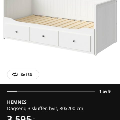 IKEA HEMNES dagseng med oppbevaring og soveplass. Dagsengen har målene 80x200 cm som enkeltseng, og kan trekkes ut til dobbel bredde. Under sengen er det 3 skuffer for oppbevaring av sengetøy eller annet . Farge: hvit.