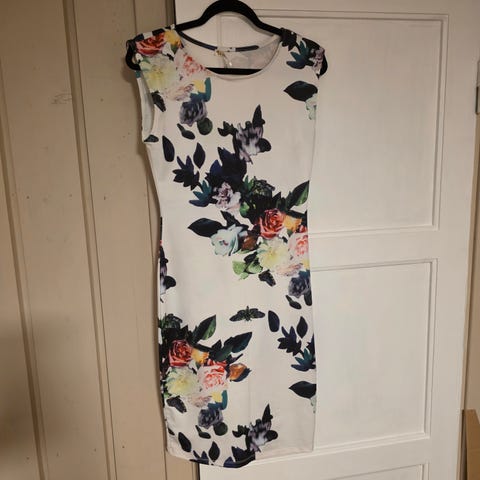 Nydelig kjole med "legg" i overdelen og glidelås bak. Kjolen er meget pent brukt et par ganger. Kjolen er ermeløs med rund hals og har et utsvingt skjørt. Den har et hvitt bunnstoff med flerfarget blomsterprint. Passer til bruk i både i hverdagen og til selskapelige anledninger.