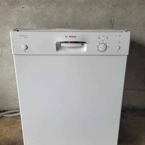 Bosch underbygd oppvaskmaskin i hvit. Maskinen har frontbetjening med dreiehjul og knapper for valg av program og innstillinger. Passer til standard kjøkkenbredde. Må hentes.