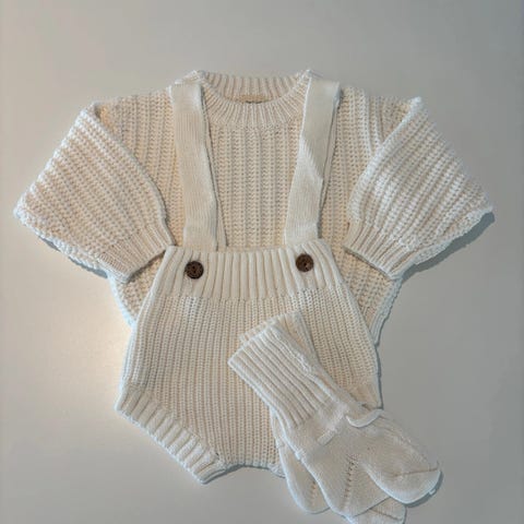 Nytt strikket sett. Strikket i drops merino extra fine. Grå-blå i fargen. Veldig fint sett!