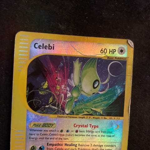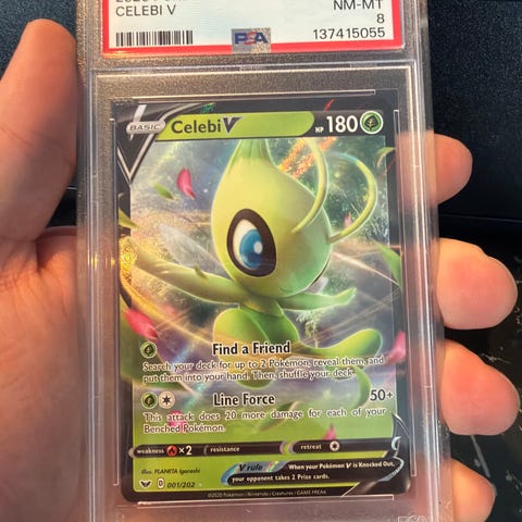 Pokémon Celebi V samlekort med holografisk overflate. Kortet viser Celebi i V-versjon med 190 HP og angrepstekster trykket på engelsk. Standard størrelse for Pokémon TCG-kort, egnet til samling og spill i Pokémon Trading Card Game.