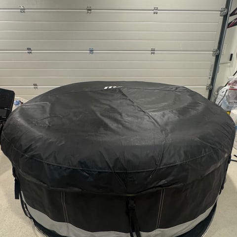 MSpa oppblåsbart boblebad i svart farge. For 6 personer. Rund modell med integrert kontrollpanel/fjernkontroll for styring av temperatur og funksjoner. Leveres med filterpatroner som vises på bildet og rensemiddel. Egnet for bruk som massasjebad utendørs eller innendørs etter produsentens anvisninger.