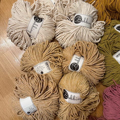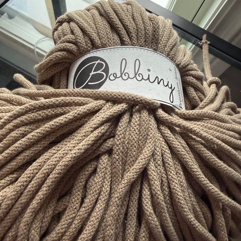 Bobbiny garn i beige farge. Garnet er laget av bomull og kommer som tykt, flettet snor- eller makramégarn. Egner seg til prosjekter som makramé, hekling, strikking eller veving av interiørartikler som kurver, tepper og puter. Nøyaktig lengde og tykkelse er ikke oppgitt.