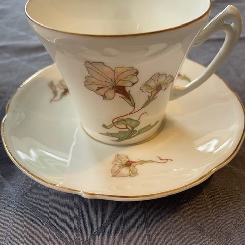 Fauna fra Porsgrunn porselen. Pent og lite brukt. Kaffekopp med skål og tilhørende tallerken i porselen. Serviset har dekor med fugler, grener og bær langs kantene, samt en tynn grønn kantstripe. 8 stk. selges samlet 1250 kr