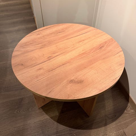 Rundt sofabord, diameter på 80 cm og høyde 40 cm.