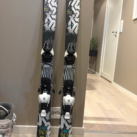Alpinski med bindinger i svart og hvitt design. Skiene har integrerte bindinger som kan justeres til passende skostørrelse innenfor anbefalt område fra produsent. Passer til bruk i alpinbakke for generell skikjøring. Twintip.