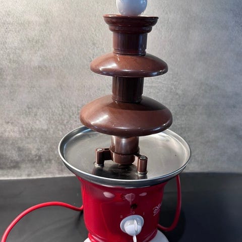 Veldig lite brukt sjokoladefontene, brukt kun 3 ganger. Selges fordi den blir alt for lite brukt. Fungerer som den skal. Dem to delene som kan tas av, kan vaskes i oppvaskmaskinen.