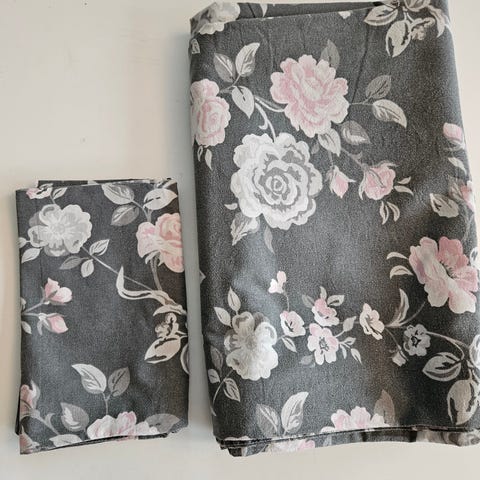 Selger to komplette sengetøy sett med blomster på en siden og lilla på andre siden.