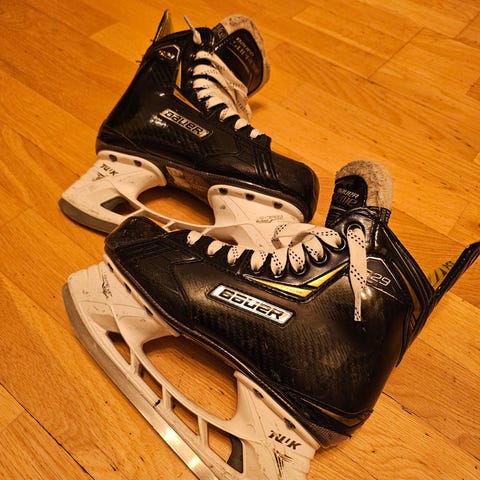 CCM Tacks ishockeyskøyter i størrelse EU 41 (US 7). Skøytene er i svart med gule detaljer og hvite lisser. Modellen er beregnet for ishockey og har faste stålskinner. Passer til bruk på isbaner for trening og fritidsspill. Innersåle og pløse er polstret for økt komfort rundt fot og ankel.