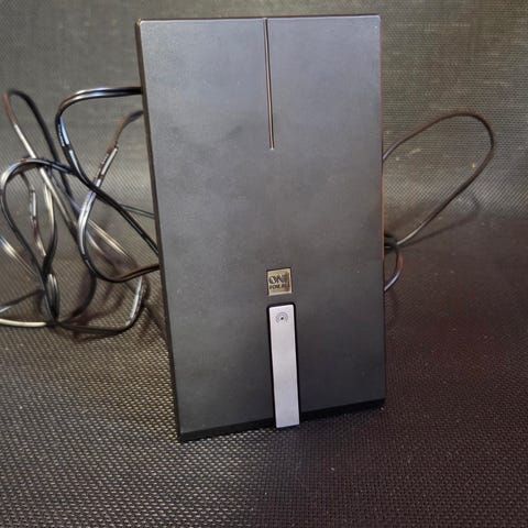 Rikstv dekoder og bordantenne. Det følger med strømkabel og fjernkontroll.