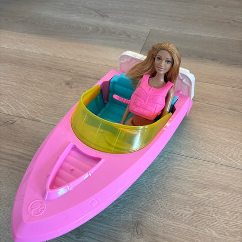 Barbie lekebåt med hundefigur. Plastbåt i rosa, blå og gule detaljer, med sitteplasser og løs hundefigur med liten blå flåte. Passer som tilbehør til Barbie-dukker og annen dukkelek, og kan brukes til rollelek med båtturer og strandtema.