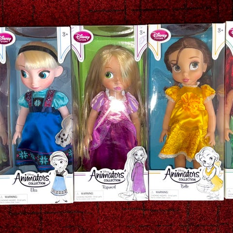 16 Originale Disney dukker 40 cm. I skap . En dukke kostet ca 400 kr med frakt. Aldri vært lekt med. Er i et skap med plexiglass. Selges samlet.