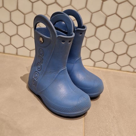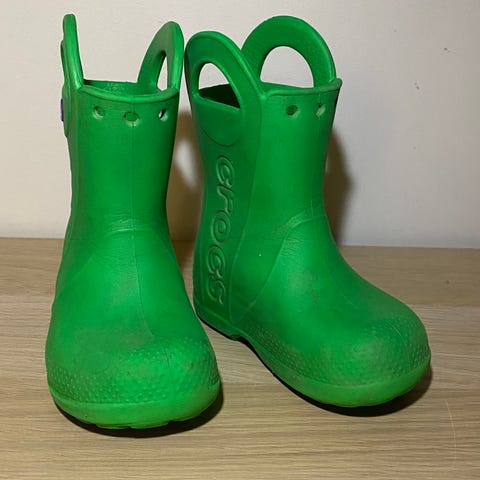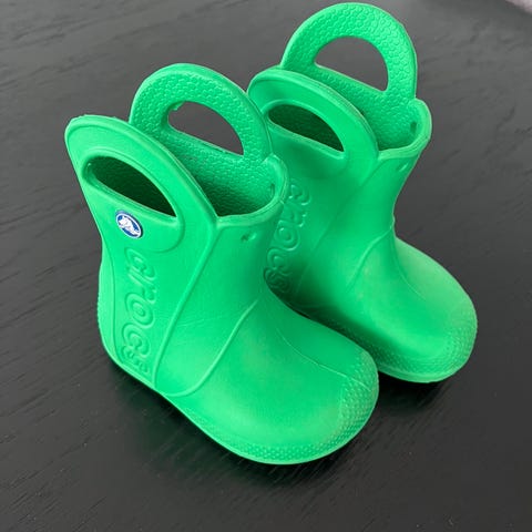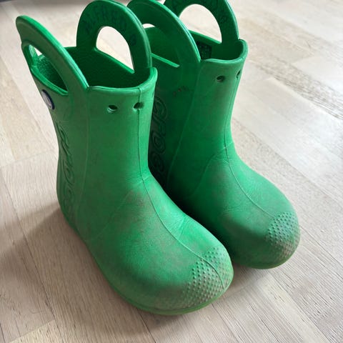 Crocs gummistøvler for barn i størrelse 33/34. Unisex-modell i grønn farge. Støvlene er laget i lett materiale med mønstret såle for bedre grep. Praktiske hemper øverst som gjør dem enkle å ta av og på.