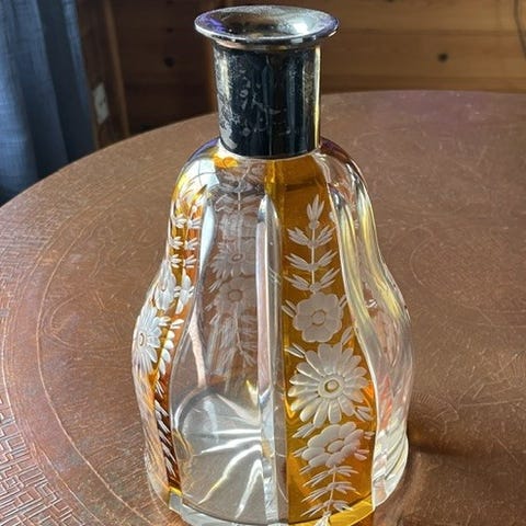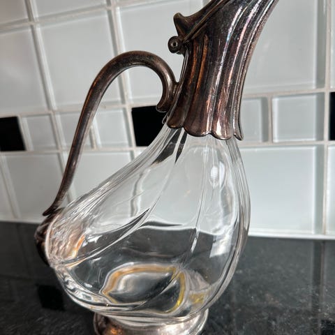 Karaffel-and. Kannen har helletut med hengslet lokk og buet hank i sannsynligvis sølvplett, da det skinner igjen etter en runde med sølv-pusseklut. Den er i flott stand, helt uten skader. Den er aldri brukt, kun stått til pynt. Pris kan diskuteres.