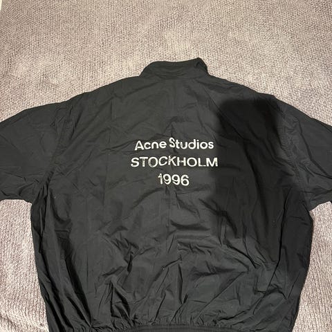 Nesten ikke brukt. Ny pris er 7.000 kr. Passer ikke helt stilen til den som fikk jakken i gave. Det er størrelsen S herre. Den skal sitte oversized. Prisen kan diskuteres.