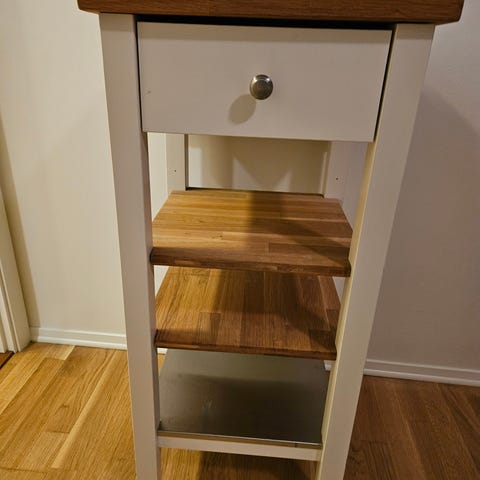 Tungt og solid sidebord/kjøkkenøy, med hjul bak for enklere flytting.