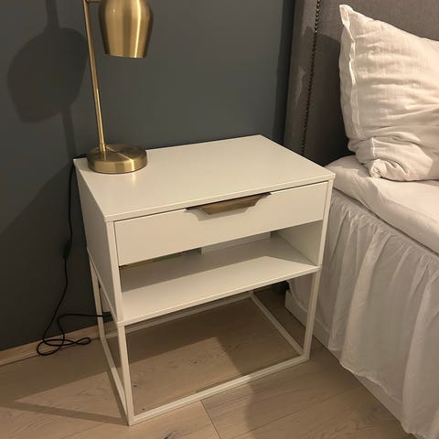Et moderne nattbord med rette linjer og praktisk skuff til oppbevaring.