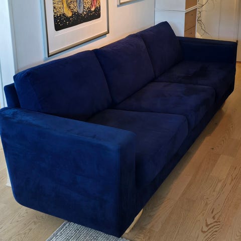 Nydelig spisesofa i blå velour selges med tungt hjerte grunnet flytting. Den er pent brukt og har ingen synlige bruksmerker. Usikker på hvilket merke sofaen er fra.