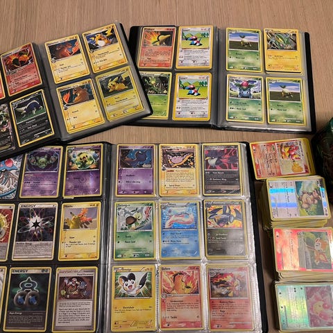 Selger en samling med eldre Pokémonkort fra ulike serier og år. Flere holografiske kort og kjente Pokémon. Kortene har variert tilstand – noen er pent brukt, mens andre har mer slitasje. Se bilder for eksempler.