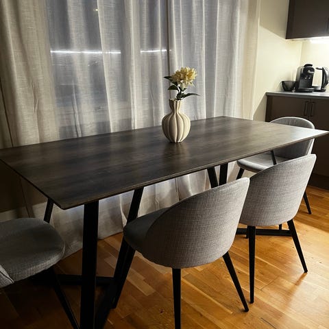 Spisebord med romslig plass til hele familien! Stødig bord fra Skeidar, med en del avskallinger i kanten rundt. Ellers er bordplaten hel og solid. Hvitt med bein i eik.