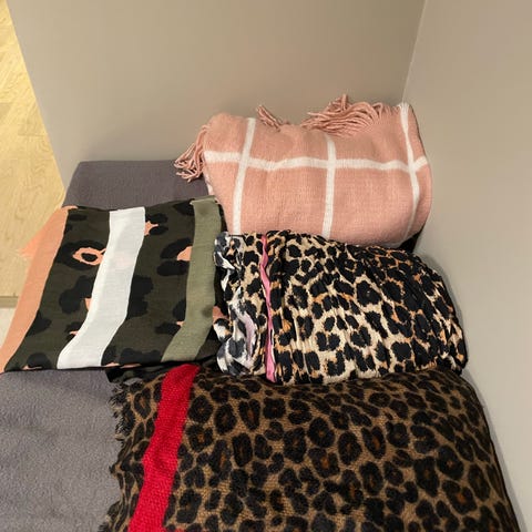 1 mønstret skjerf kr 200,- 1 strikket skjerf myk ull kr 250,- 1 stk bomull kr 150,-